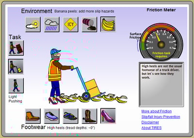 Ein unterhaltsames Tool/Spiel von keeptruckingsafe.org ermöglicht es Benutzern, einen virtuellen Mitarbeiter verschiedenen Wetterbedingungen, Schuhwerkarten und Aufgaben auszusetzen, um die Auswirkungen verschiedener Faktoren auf das Risiko von Ausrutschen, Stolpern oder Stürzen zu sehen.